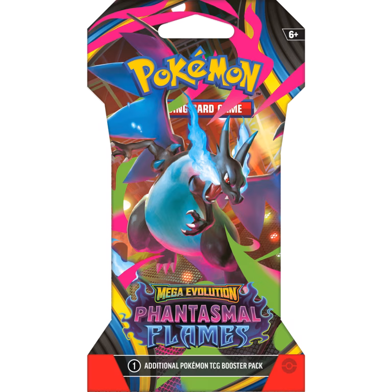 The Pokémon TCG: Mega Evolution – Phantasmal Flames Sleeved Booster Pack is a 2025 release containing 10 random cards from the Phantasmal Flames expansion. Each pack is sealed in a protective cardboard sleeve, often featuring artwork of Mega Charizard X, Mega Gengar, Mega Heracross, or Mega Lopunny. These packs include a chance to pull rare cards, such as Mega Charizard X ex and Mega Gengar